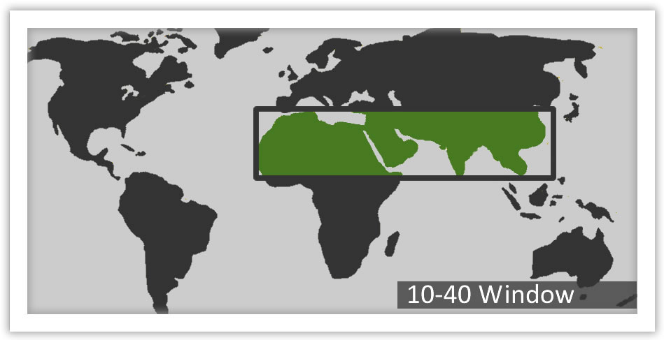 | 10/40 Window The 10/40 Window is the rectangular area of North Africa, the Middle East and Asia approximately between 10 degrees north and 40 degrees north latitude. The 10/40 Window is often called "The Resistant Belt" and includes the majority of the world's Muslims, Hindus, and Buddhists. The 10/40 Window includes several countries, such as Indonesia, that are close to 10 or 40 degrees north latitude and have high concentrations of unreached peoples. An estimated 4.43 billion individuals residing in approximately 8,811 distinct people groups are in the revised 10/40 Window. The 10/40 Window is home to some of the largest unreached people groups in the world such as the Shaikh, Yadava, Turks, Moroccan Arabs, Pushtun, Jat and Burmese. The 10/40 Window has several important considerations: first, the historical and Biblical significance; second, the least evangelized countries; third, the unreached people groups and cities; fourth, the dominance of three religious blocs; fifth, the preponderance of the poor; sixth, the strongholds of Satan within the 10/40 Window. |